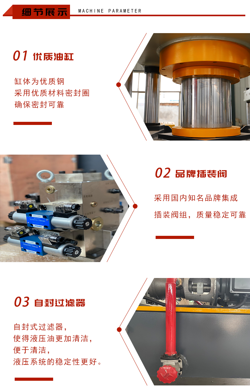 100吨爆炸盐液压机具有脱模超压力保护和微回功能,采用可调力和行程的上压头脱模保护装置,保证了产品的合格率和避免模具的损坏。 能按照产品成型要求,在触摸屏上灵活设定各产品台阶驱动部件的动作程序,无需改动内部程序,符合了行业产品形状复杂形状的压制成型要求,通用性强