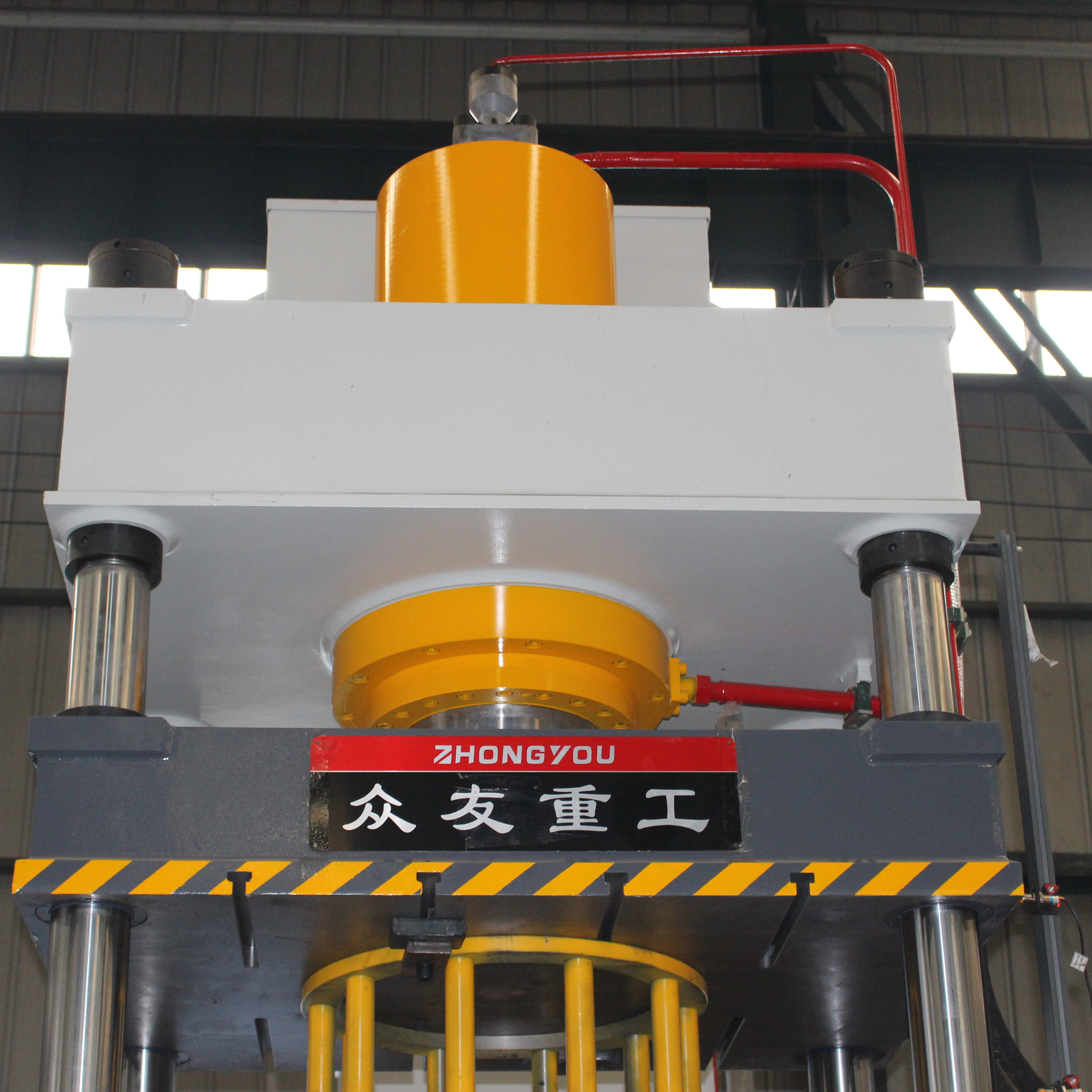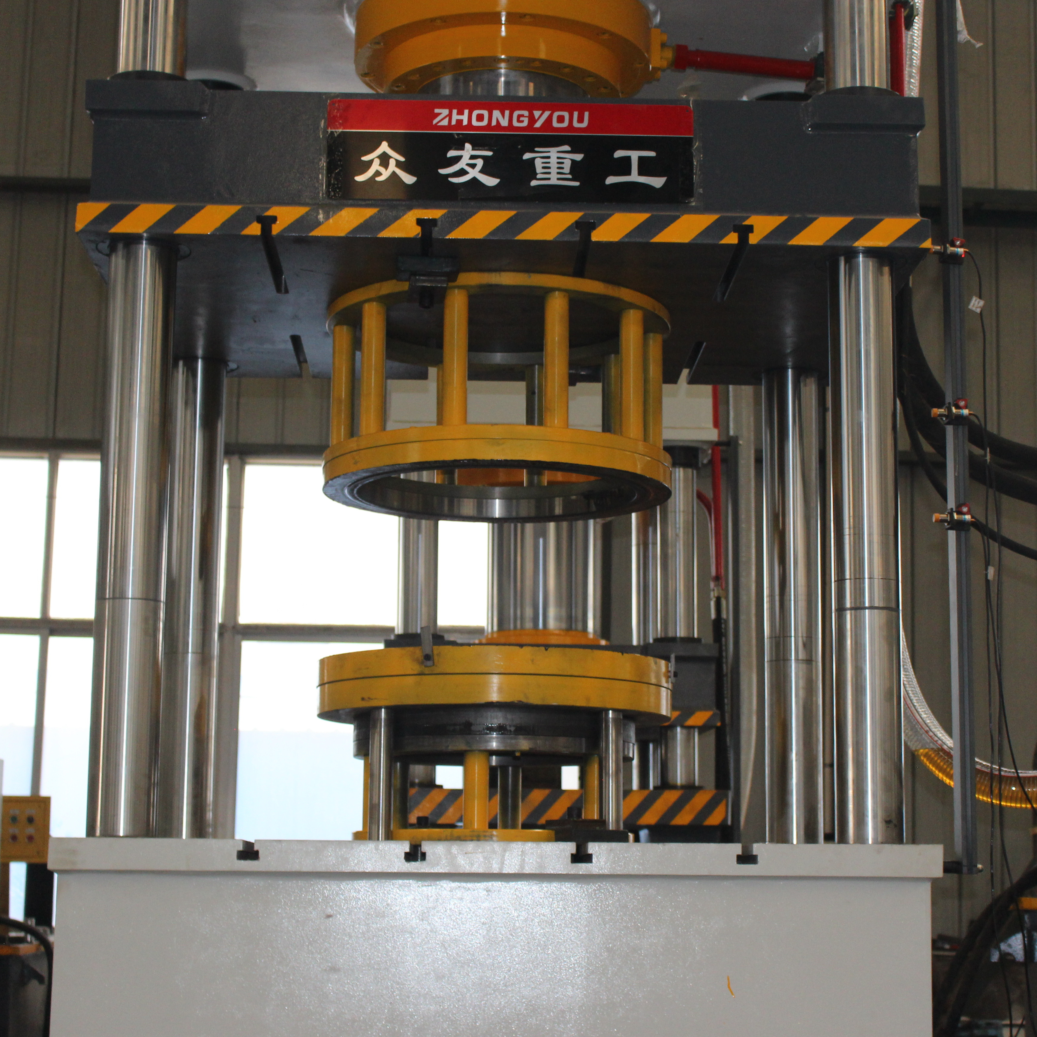 1.1、液压机机身采用三梁四柱式结构,上梁、中间滑梁、工作台通过立柱和紧固螺母、调整螺母结合成一个固定机架,机架精度靠调节螺母调整,具有良好的强度、刚度和精度保持性。