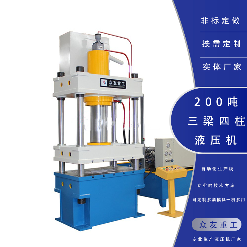 200吨四柱液压机是山东滕州众友重工机械设备有限公司自主研发生产设计的,设备由主机及控制机构两大部分组成,通过管路及电气装置联系起来构成整体。主机部分包括机身、主缸、限程装置等。控制机构包括液压泵站(动力系统)、电器箱、移动操纵台等组成。四柱式结构为液压机很常见的结构形式之一,它的显著特点是工作空间宽敞,便于四身观察和接近模具,整机结构简单,工艺性好。除此以外,公司可可以根据用户参数需求进行设计生产各吨位粉末成型液压机、框式液压机、金属拉伸液压机等