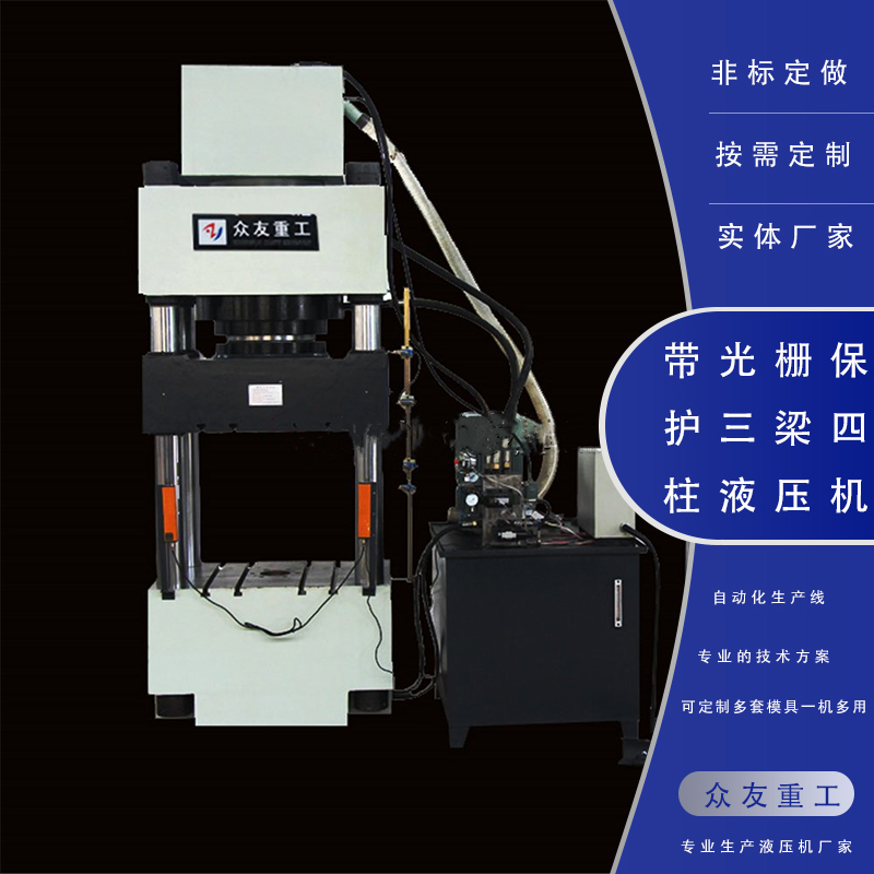 三梁四柱液压机结构简单经济实用,它由上横梁,滑块,工作台,立柱,主缸,液压动力系统及电器系统等部件组成。它的显著特点是工作空间宽敞,整机结构简单,工艺性较好。机身由上横梁,活动横梁,工作台和四根立柱组成,工作缸安装在上横梁内,活动横梁与工作缸的活塞联接成一整体,以立柱为导向做上下运动,并传递工作缸的内产生力量,对制件进行压力加工。