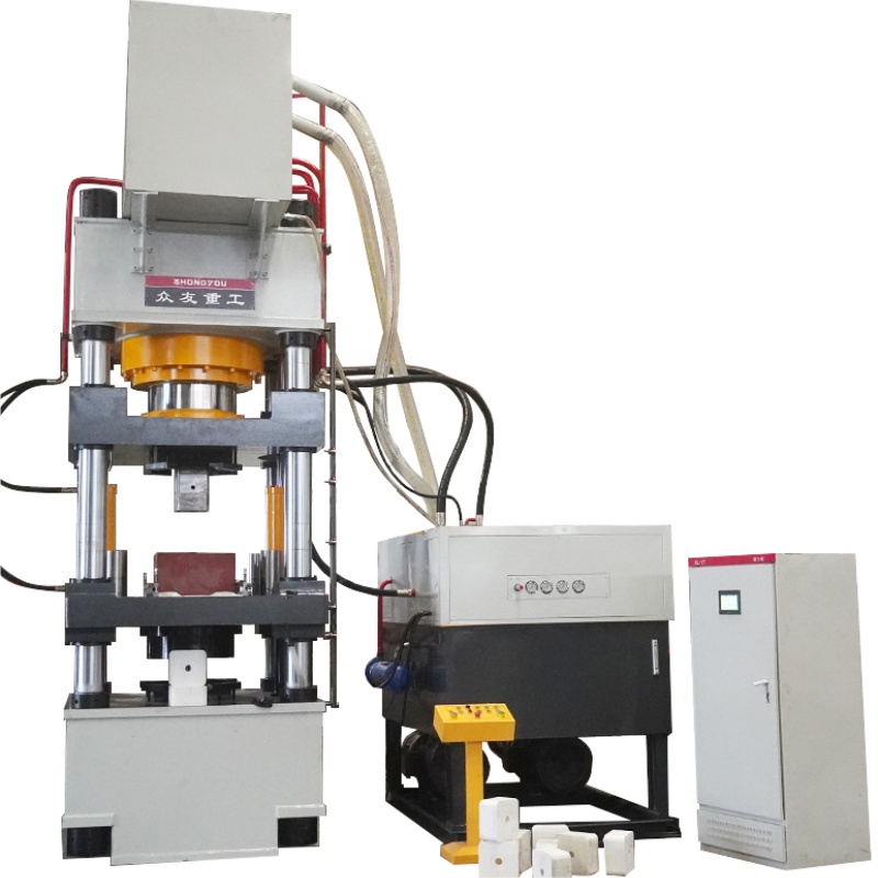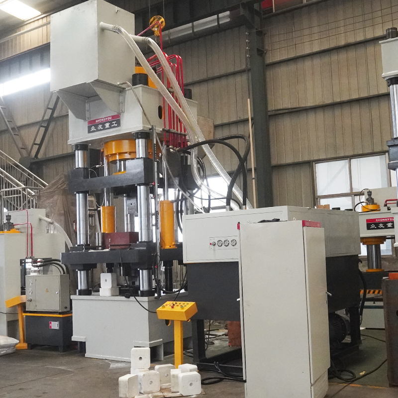 800吨牛羊舔砖成型液压机为国外客户定制,设备采用四梁四柱结构,具有高度的自动化和稳定性。
