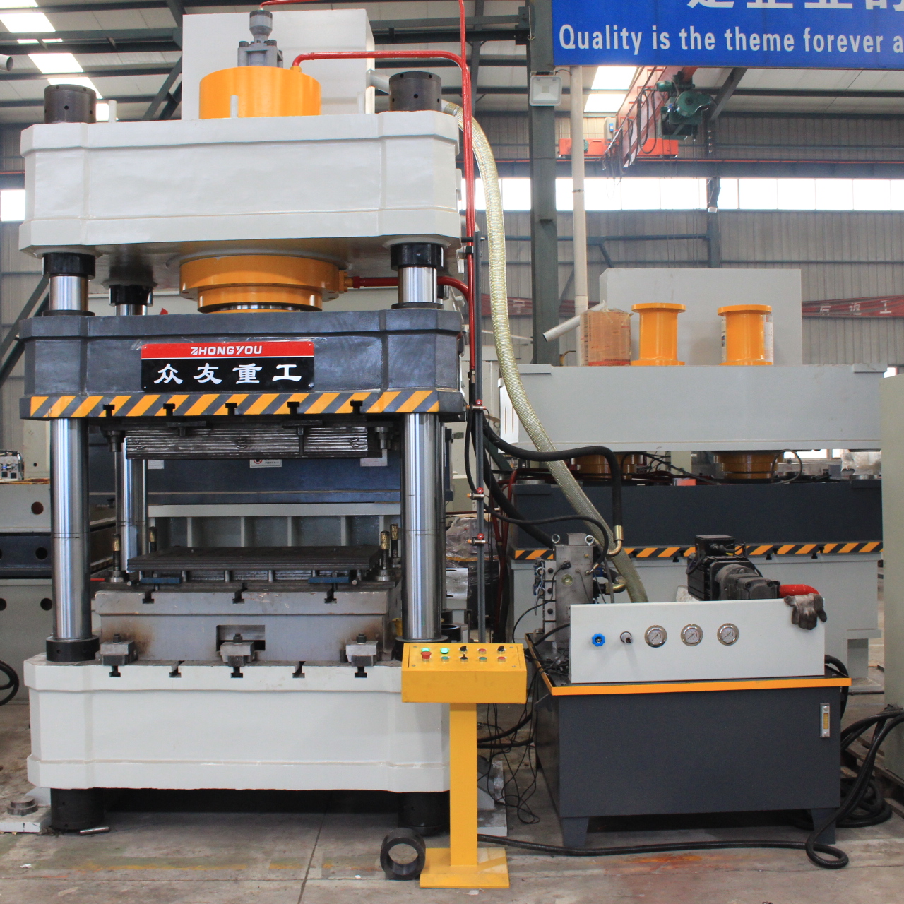 四柱液压机由主机及控制机构两大部分组成。四柱液压机主机部分包括机身、主缸、顶出缸及充液装置等。动力机构由油箱、高压泵、低压控制系统、电动机及各种压力阀和方向阀等组成。