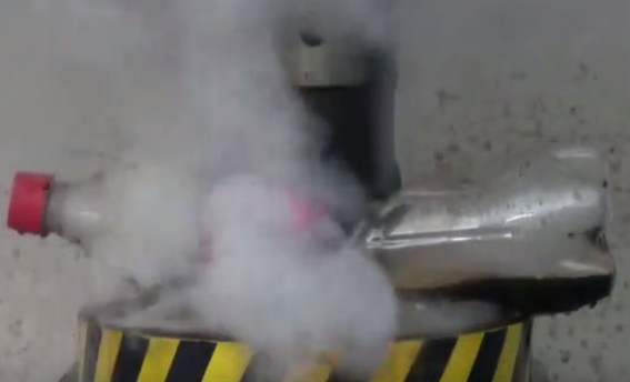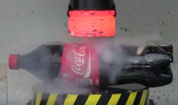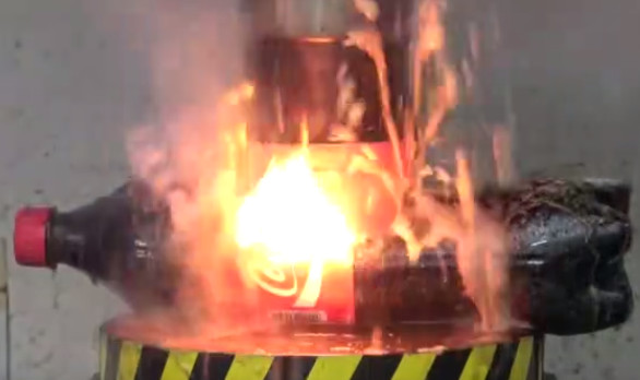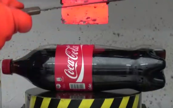 液压机经过无数次实验后,已经无往而不胜了。国外有一男子用液压机做了这样一个实验,把可乐放在1000℃烧红液压机下,会发生什么样的事情呢?